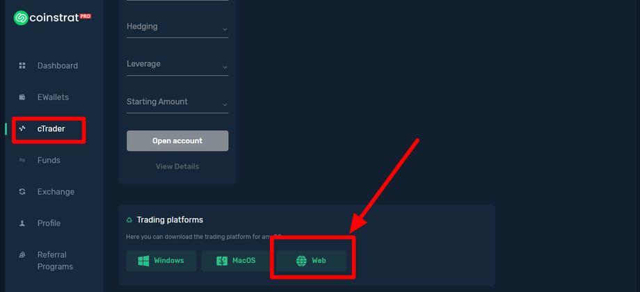 There are 2 ways you can access cTrader web app. You can either go directly to : https://app.coinstrat.pro/